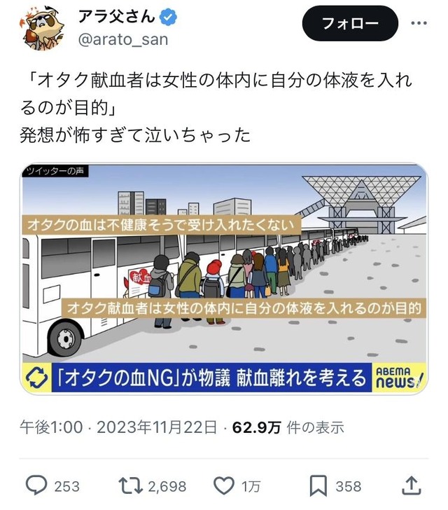 [feedzy-rss feeds="https://itainews.com/index.rdf" max="7" feed_title="no" meta="yes" summary="no" thumb="yes" size="50"] 【悲報】「オタクの血NG」が物議、献血離れを考える「オタクの献血者は女性の体内に自分の体液を入れるのが目的」と言うぶっ飛んだ意見も・・・ この記事を読む ← 【愕然】ジャニーズ事務所、834人の児童レ◯プ確認 「THE W」決勝進出12組発表 →