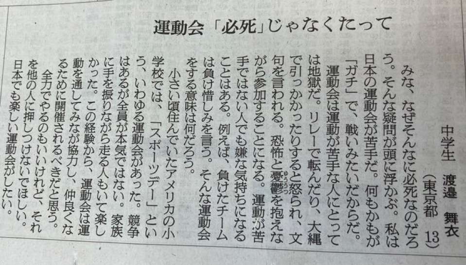 13歳女子が投書「日本の運動会は息苦しい、先生も生徒もミスを許さないガチ感が気持ち悪いです」