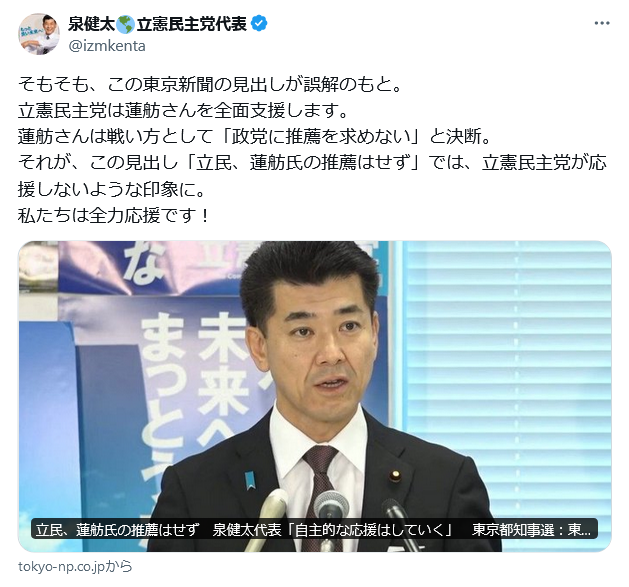 [feedzy-rss feeds="https://itainews.com/index.rdf" max="7" feed_title="no" meta="yes" summary="no" thumb="yes" size="50"] 立憲・泉健太代表「東京新聞の見出しが誤解のもと。立憲民主党は蓮舫さんを全面支援します…私たちは全力応援です!」 この記事を読む ← 記者「朝堂院大覚さんが…」ゆりこ都知事「この話はやめ!ストップ!帰りまーす!」 【都知事選】記者「副知事じゃダメですか」蓮舫「副知事じゃダメです」…「今は残念ながら知事がトップダウン的に決めている」自身は「ボトムアップ」強調 →